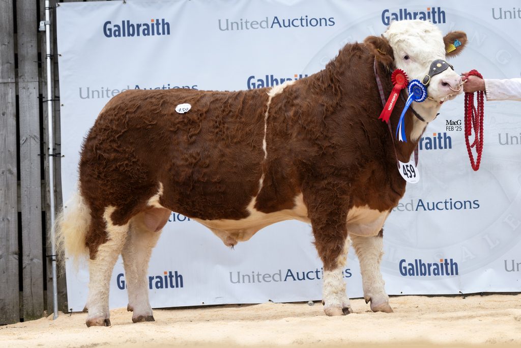 Joining the Strathisla Simmental herd as a new stock sire is Overhill House Presley. He stood reserve junior champion and was secured with a final bid of 13,000gns. Again, a long and well grown bull who is well put together with good legs, he is sired by Pistyll Kingsman who has bred bulls to 46,000gns.